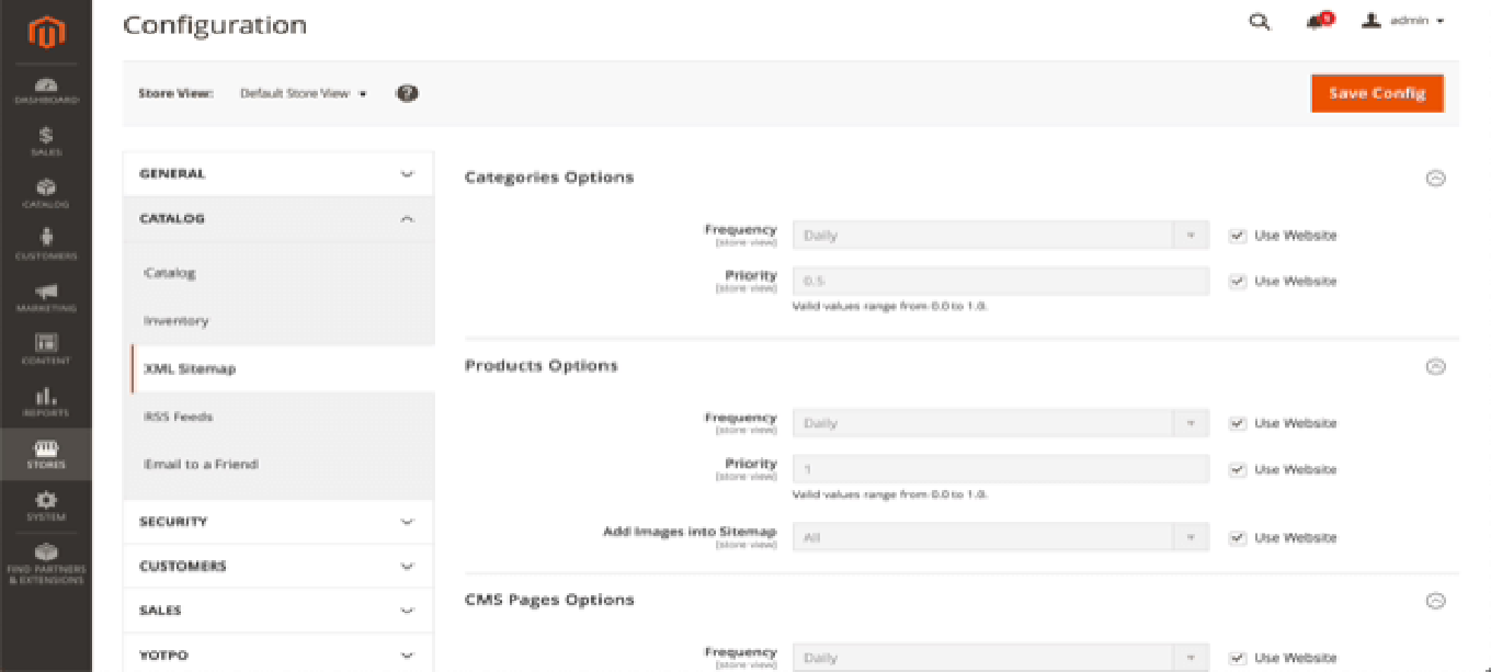 - By default, the options for categories, products and CMS pages are configured correctly. Google doesn’t use the Frequency and Priority hints, so there’s no need to change anything there. By default, images are included in the XML Sitemap as well.