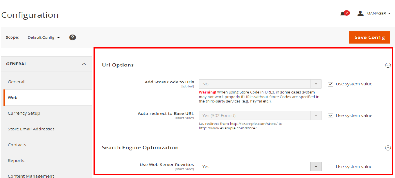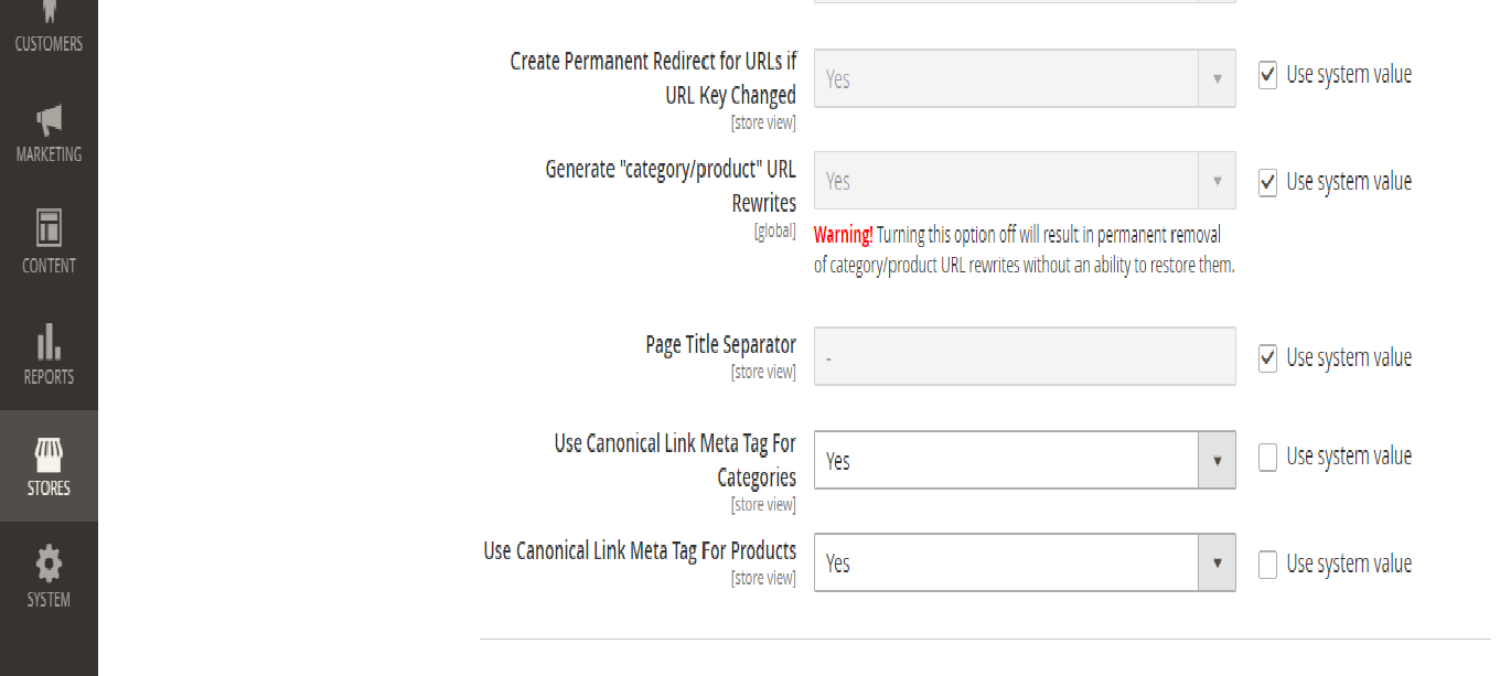 To turn on the use of canonical URLs, log on to your Magento backend and navigate to: