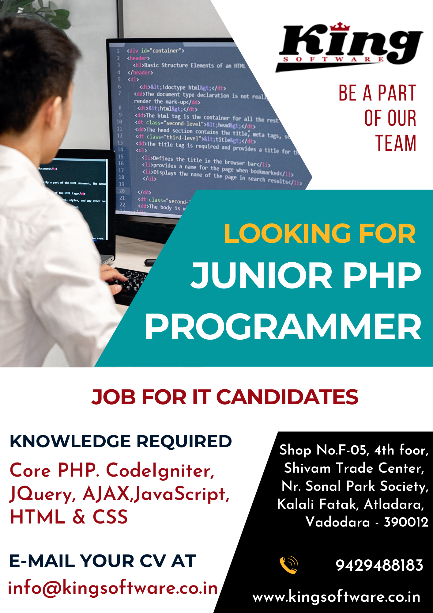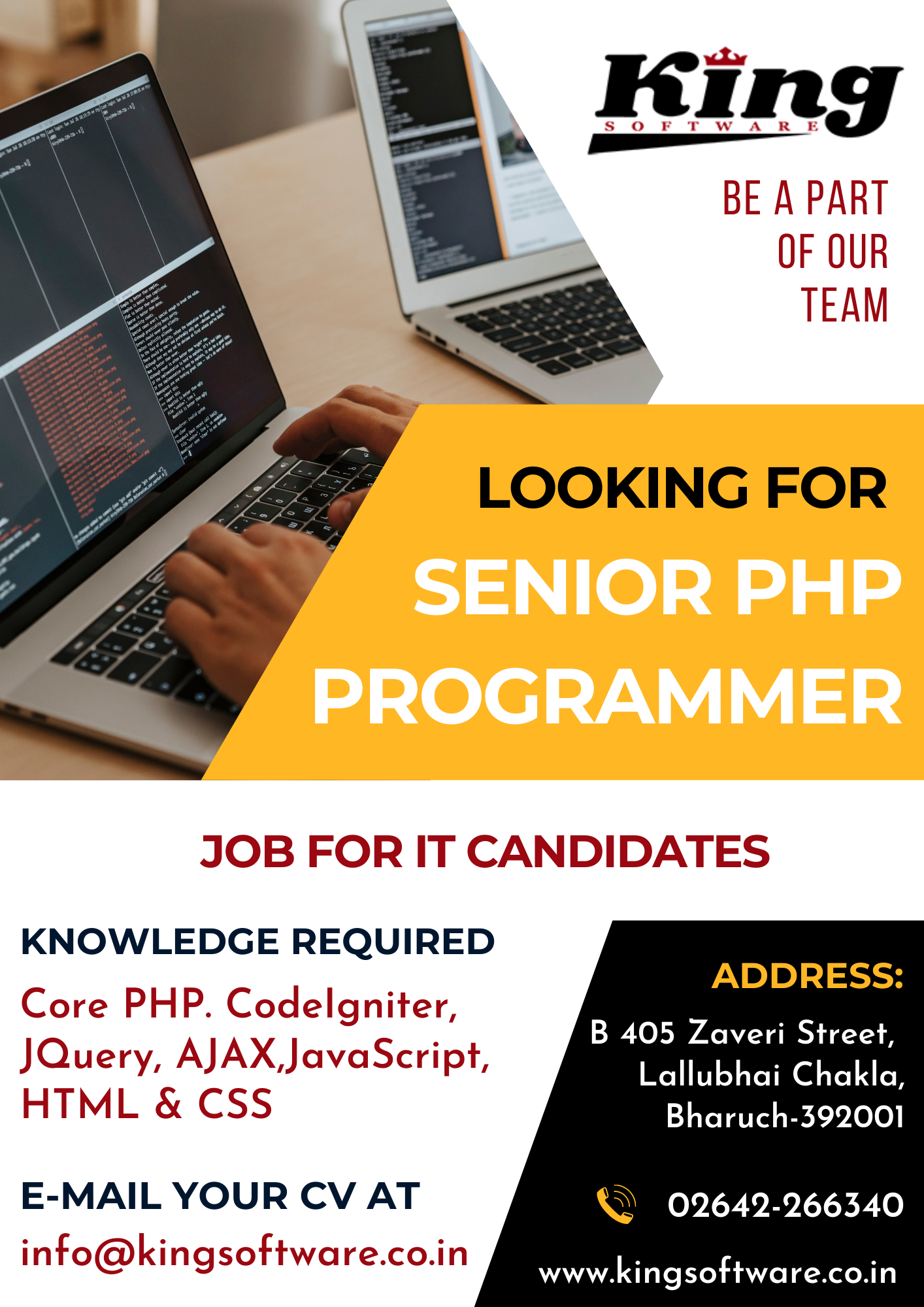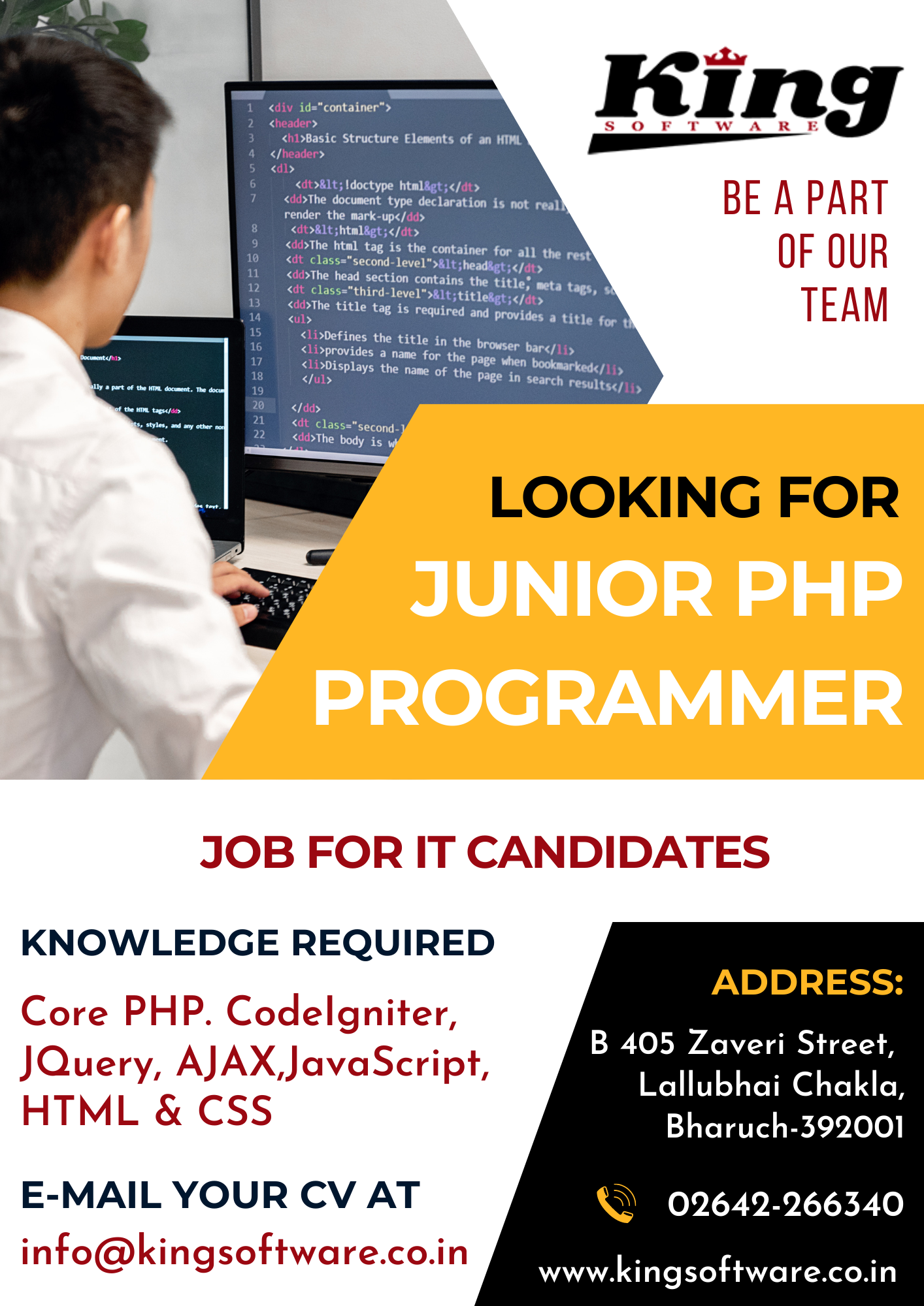 Kingsoftware is looking for Junior, Senior PHP Developers and Office Assistant for Bharuch & Vadodara Location. Salary is at par with the expertise. Experience of minimum 2 years for Senior PHP Developer & Experience of minimum 6 months for Junior PHP Developer & skilled Office Assistants are all welcome.