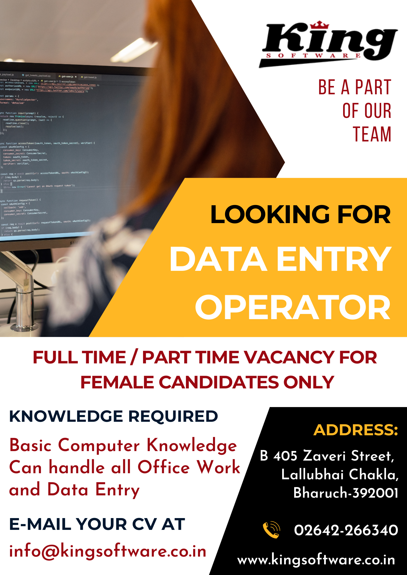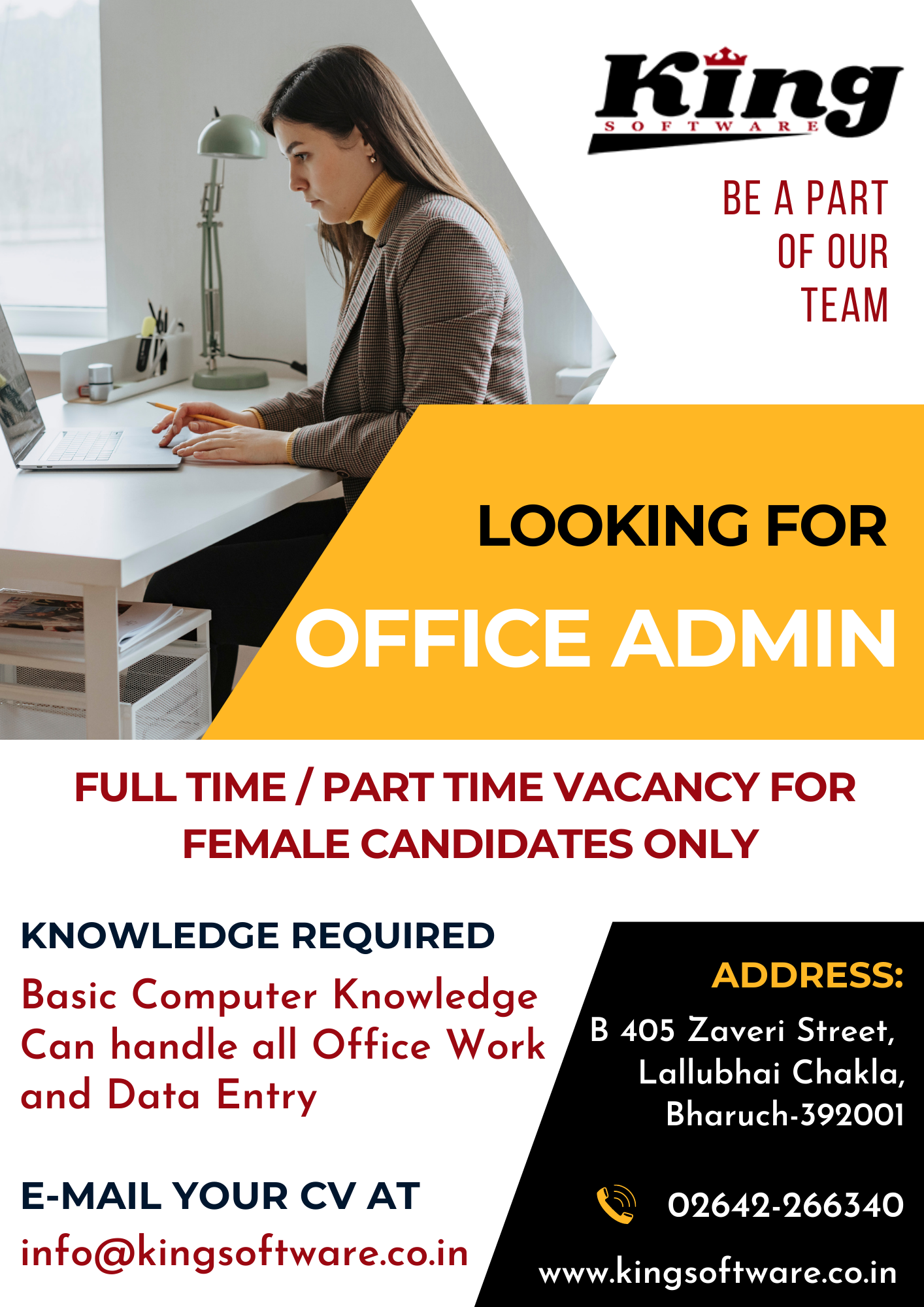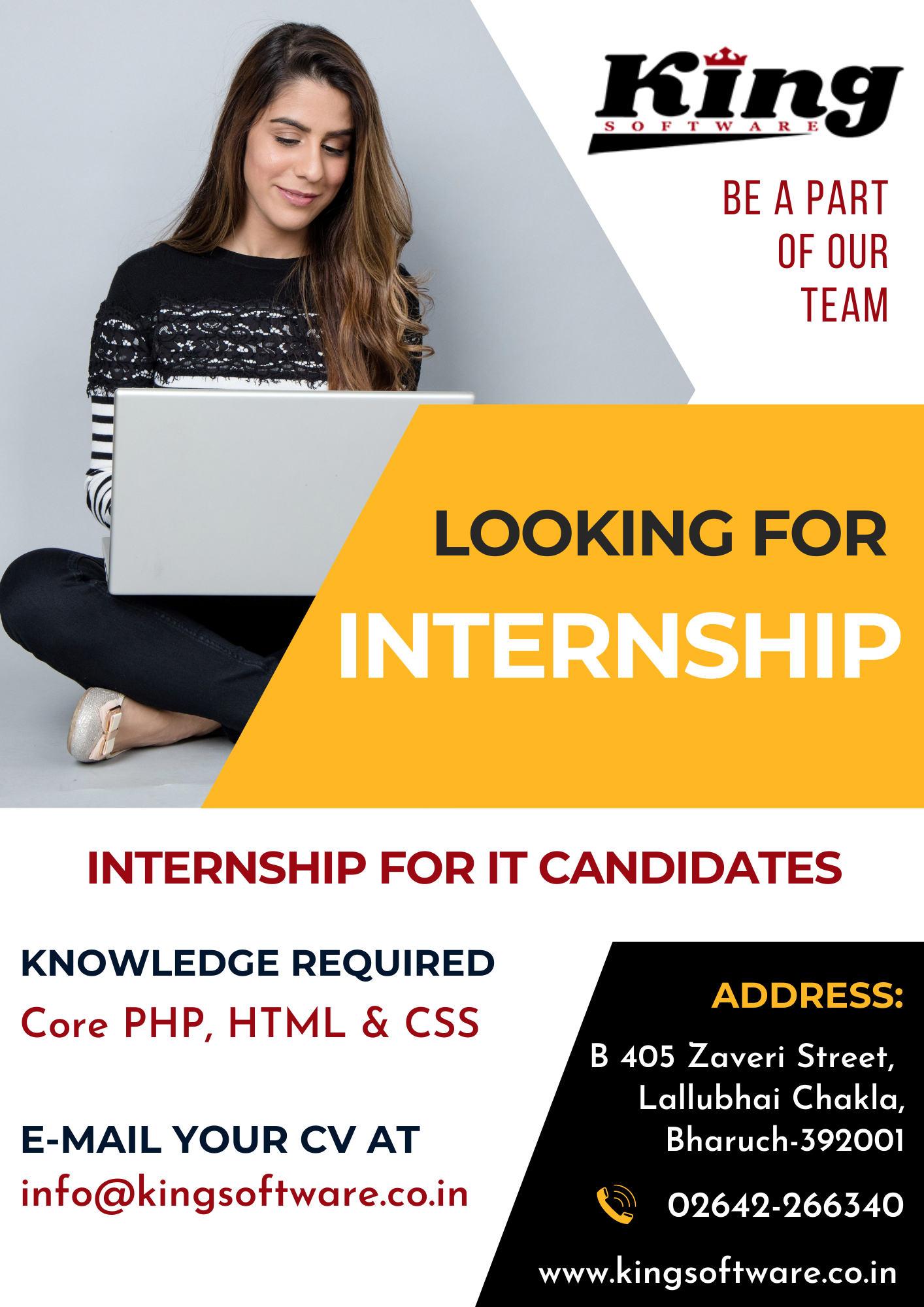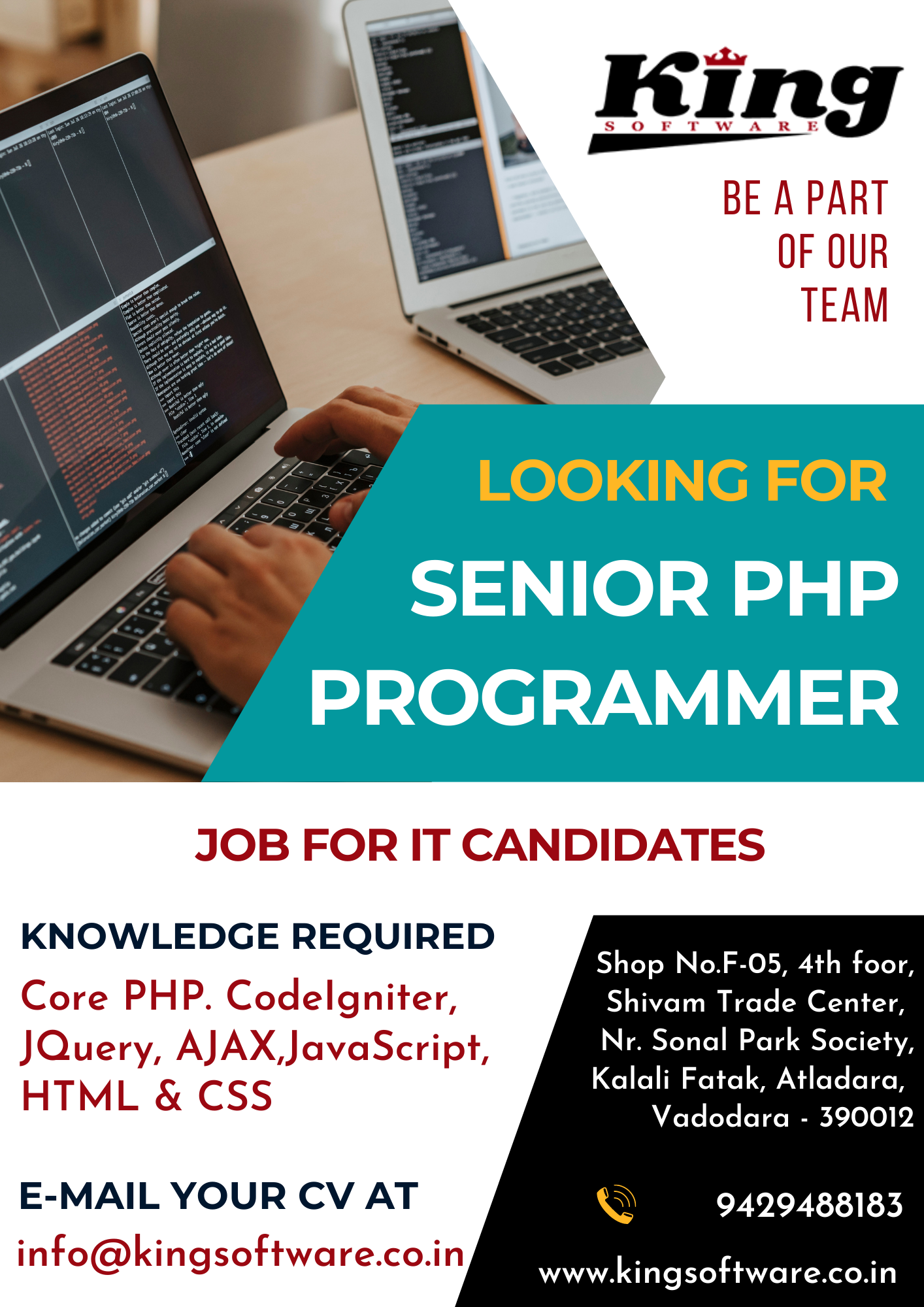 Kingsoftware is looking for Junior, Senior PHP Developers and Office Assistant for Bharuch & Vadodara Location. Salary is at par with the expertise. Experience of minimum 2 years for Senior PHP Developer & Experience of minimum 6 months for Junior PHP Developer & skilled Office Assistants are all welcome.